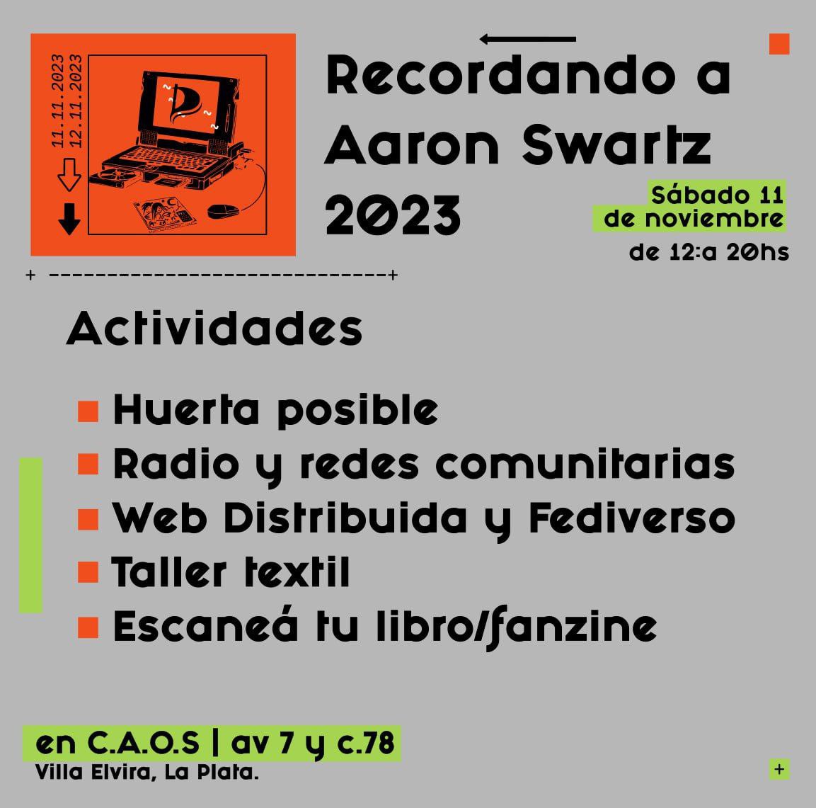 Este sábado 11 de noviembre de 12 a 20hs estaremos recordando a Aaron Swartz en C.A.O.S (av 7 y c. 78, Villa Elvira, La Plata), con actividades desde el Partido Interdimensional Pirata y amigxs.